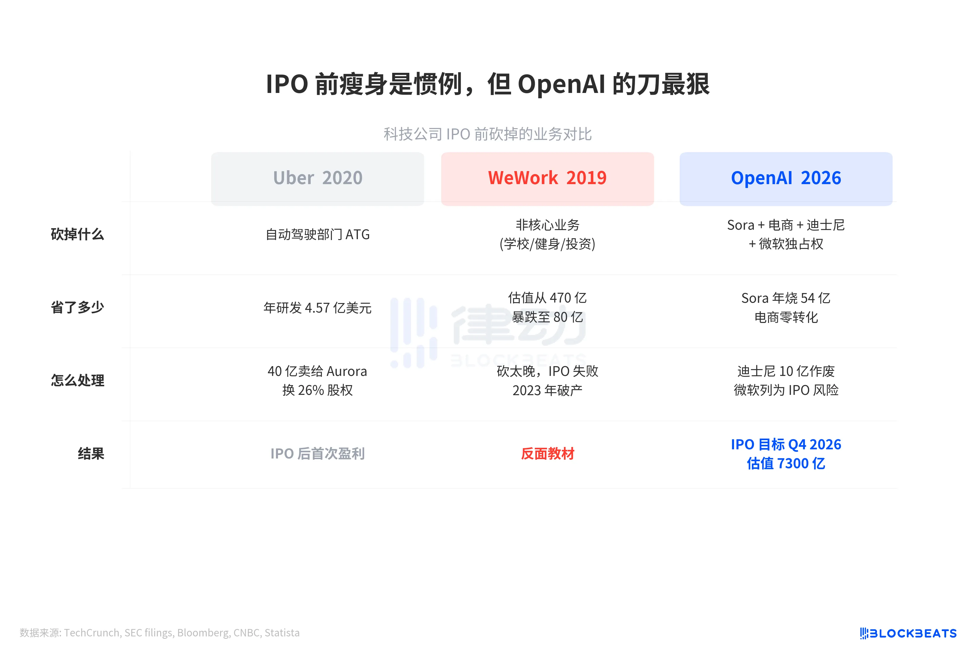 OpenAI's approach is more similar to Uber's: proactively cutting off high-cost, low-return business lines, cleaning up the financial structure before going public. The difference lies in scale. Uber cut off ATG, burning $457 million annually, while OpenAI cut off Sora, burning $5.4 billion annually, differing by an order of magnitude. Along with the $1 billion Disney write-off, the dissolution of the e-commerce team, and the public downgrade of the Microsoft relationship, OpenAI is conducting the largest-scale business line cleanup in tech history during its IPO sprint.